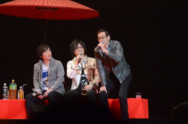 保志総一朗さんはお茶を、森川さんはホッピーを、そしてお酒が大好きなことで知られる若本さんはアセロラドリンクを選びかけたものの、会場からの「えー!」という声に押されるように苦笑いしながら焼酎をチョイス。それでも最後にはいつの間にかきっちりと飲み干していたのはさすがでした。