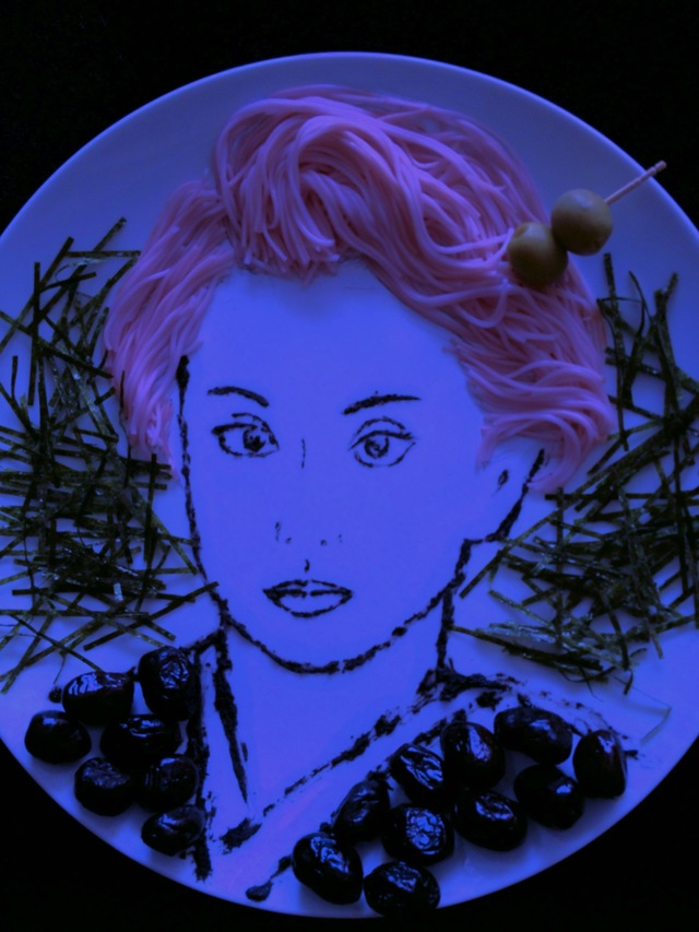 顔を描くのは、練りごまとみりんでペーストを作り挑戦しました。しかし思いのほか伸びが悪く、大変苦労するはめに。麺に合う味で、且つ伸びやかに滲まず線が描けるペースト作りに奮闘する毎日です。その他、 のり、黒オリーブ、グリーンオリーブも準備しました。