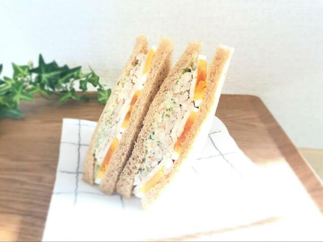 サンドイッチの具は、ブロッコリー、ごぼう、サラダチキン、ゆで卵で、ハニーマスタードソースで味付けされています。