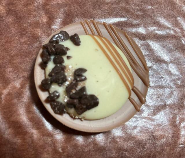 ヘーゼルナッツをペースト状にしてホワイトチョコに練り込み、ミルクチョコを乗せた甘みの強いチョコレート。