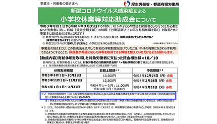 厚生労働省は、「小学校休業等対応助成金制度」の対象期間を、2021年12月31日から22年3月末までに延長する改正を行った。この改正と、学級閉鎖・学校閉鎖の急増を受けて、今年1月下旬あたりから告知する団体・自治体などが増えている。