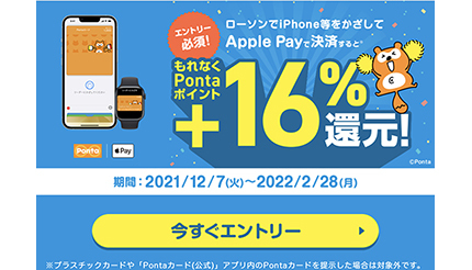 2月28日まで、エントリーの上、店頭で「Apple Payで」と伝えて、PontaポイントとApple Pay(iD/QUICPay/Suica)の決済を同時に完了すると、Pontaポイントでもれなく決済額の16%還元するキャンペーンを実施中だ。プラスチック製のPontaカードやアプリ内のPontaカードを提示した場合は対象外。