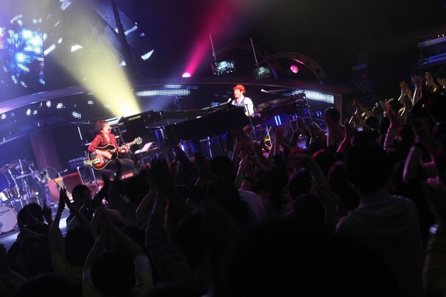 いや、昔と今のスキマスイッチで、ひとつ大きく変わったことがある。鍵盤・常田真太郎のアフロ頭がいつの間にか消えていたことだ! というわけでアンコールでは懐かしのアフロヘアがうやうやしく降臨! 「ここでやっとスキマスイッチだって気がついた人もいるかも(常田)」と自虐ネタを飛ばしつつ、「初心に帰ってデビュー曲をやります!(大橋)」と放たれた『view』では、真っ赤に染まる照明の中でアフロも飛ばんばかりの熱っぽい演奏を見せつける。