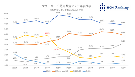 代わってASRockとMSIは15年以降シェアが急伸。ASRockは19年に同社で過去最高の32.6%のシェアを獲得。MSIも21年は同社で過去最高の21.2%となり、過去最低だった12年のシェア3.2%から約7倍も躍進している。