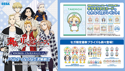 「限定キラキラホロカード」のほか、キャンペーン期間中、「東京リベンジャーズ ちびキャラペンギン BIGぬいぐるみ ~セガ限定~」をはじめとするぬいぐるみやアクリルスタンド、タオル、クッションなど「東京リベンジャーズ」のセガ限定景品が登場する。ノベリティはなくなり次第終了となる。