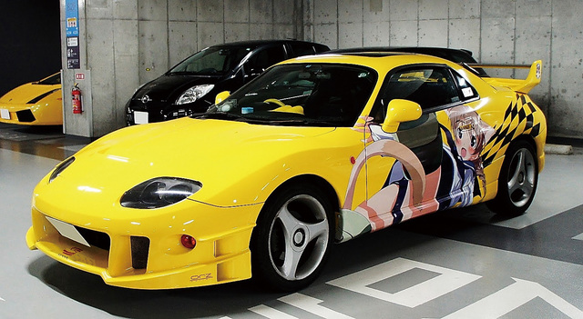 鮮やかな黄色の車体にイラストが映える、見た目に楽しい一台。キャラクターの関係性も加味して考え抜かれた配置で、生き生きとした表情も魅力的。原作ファンも納得のセンスあふれる痛車だと言える。