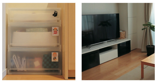 リビングで着替えているのだから、子ども服はリビングのテレビ収納の中に入れていました。開ければ、何がどこにあるか分かりやすいシールを貼って分別しておくと、自分で選んで着ることができます。