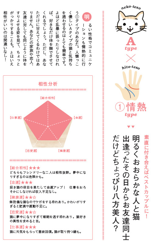 『ねこてそ』では、猫の手相ばかりでなく、人間の手相についても解説されています。人と猫との相性チェックが、手相でできるのだとか。私の手相は、『ねこてそ』の分類では、感情線が上がり、頭脳線が下がった「1:情熱タイプ」。Aタイプとの相性は…
