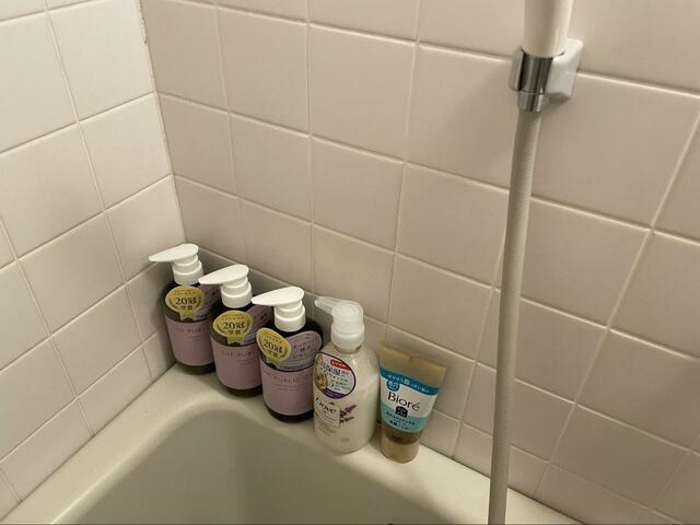 また、浴室は近くにシャンプーやリンス、ボディーソープなどを置く場所がなく、浴槽のふちに置いています。