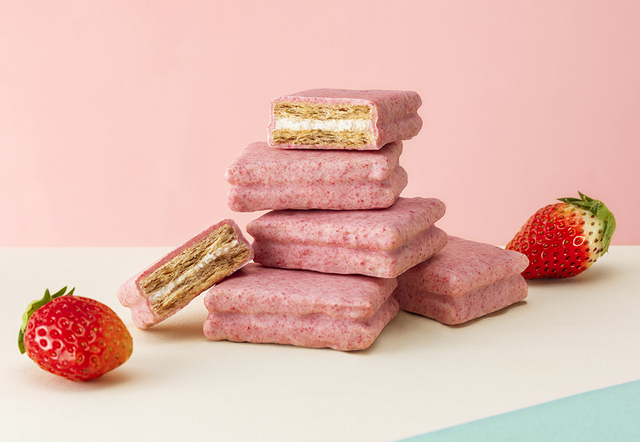 本商品は、シュガーバター香るさくさくのミルククリームサンドをまるごとひとつ、ストロベリーショコラで贅沢に包みこんでいます。