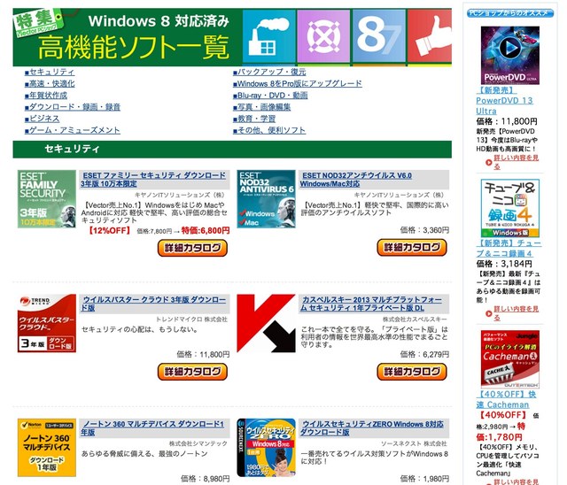 ベクターといえば、やはりソフト。もちろん、Windows 8用のソフトも多数紹介されています。「Windows 8対応済み高機能ソフト一覧」では、主にメーカー製のパッケージソフトが紹介されています。