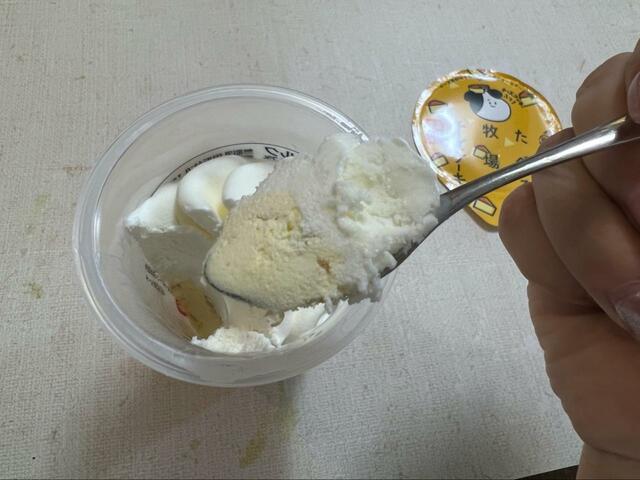 個人的には上段のミルクアイスを全部食べずに、チーズケーキアイスと一緒にすくって食べるのが、2種類の味を口の中で一緒に楽しめてオススメです!