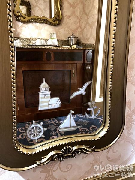 まずはバスルーム過ぎてすぐの鏡の下のステッカーをパチリ!