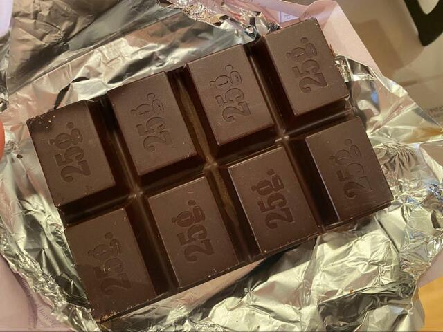 分厚い板チョコが入っていて200g入っていて、ひとかけらは25gです。