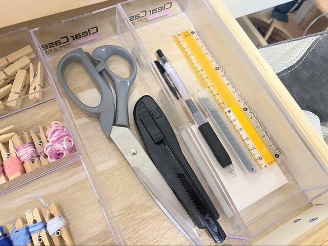 私はデスクの上に散らばった細かいものをとりあえず引き出しにいれてごちゃついてしまうクセがあるので、真ん中に仕切りのついたトレーを購入しました。