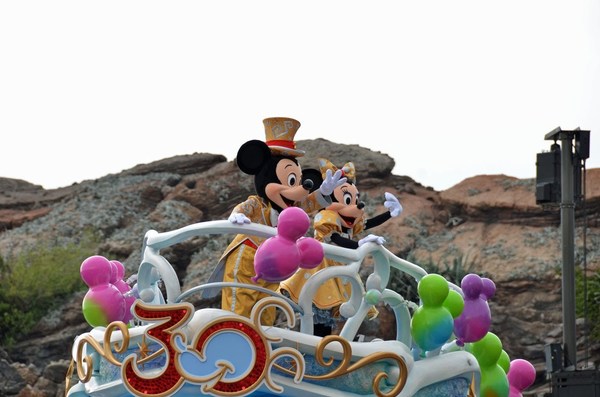ミッキーマウスたちが、30周年のロゴが入った船に乗って、メディテーレニアンハーバーの海に登場します。30周年のテーマソングとともに挨拶にきてくれるキャラは、ミッキーマウス、ミニーマウス、ドナルドダック、グーフィー、プルート、ダッフィー、シェリーメイの7キャラクター。