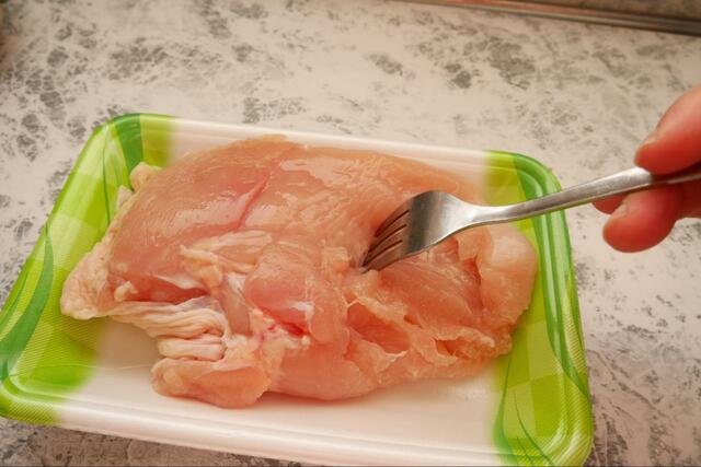 1.ブライン液が染み込みやすくなるように、鶏むね肉にフォークで穴をあけます。