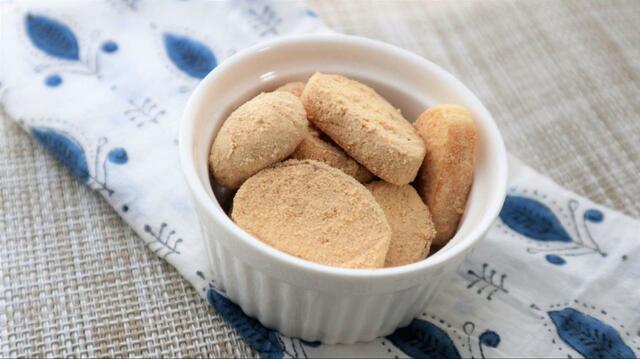 加熱直後にきなこ+きび糖+塩を混ぜたものをまぶしたら、お菓子の「ふんわり名人」のような味わいになりました。