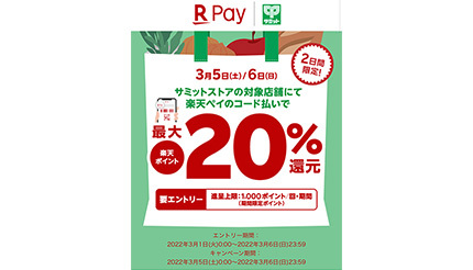 楽天ペイメントは、スマートフォン決済サービス「楽天ペイ(アプリ決済)」で支払うと、決済額の最大20%の楽天ポイントを進呈する「サミットでのお買い物で最大20%還元キャンペーン!」を3月5日・6日に実施する。事前エントリーはすでに受け付けている。