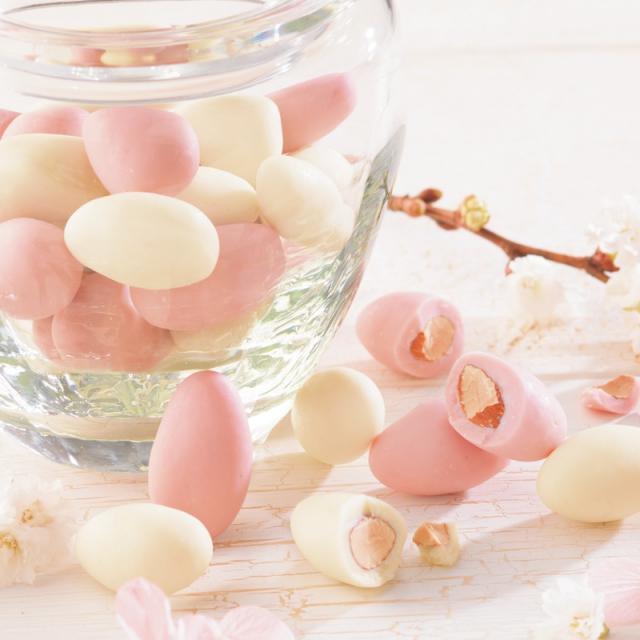 ローストしたアーモンドを、桜風味のチョコレートでコーティング。