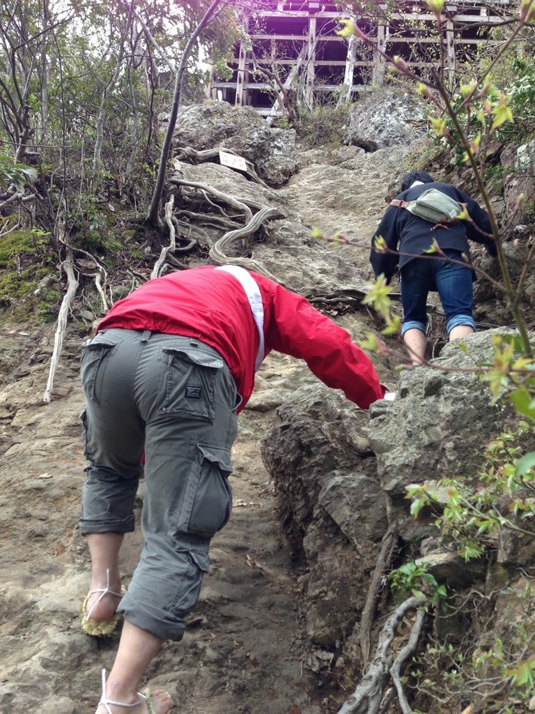 しばし投入堂を眺めたあと、下山。実は登りよりも下りのほうが危険。かなり慎重に降りて来ましたが、途中わらじから出た右足小指を岩に擦りつけてしまい、かなりすりむいてしまいました。骨折や肉離れなどしなくてよかった。あんなところで怪我をしてしまったら、下山どころではありません。