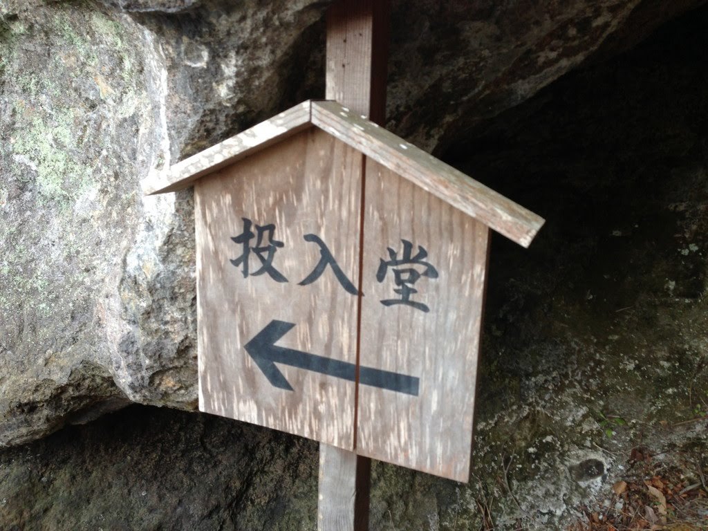 「投入堂」の看板が! も、もうすぐ投入堂にたどり着きます。元結掛堂を抜けて崖を右に回り込むと……。