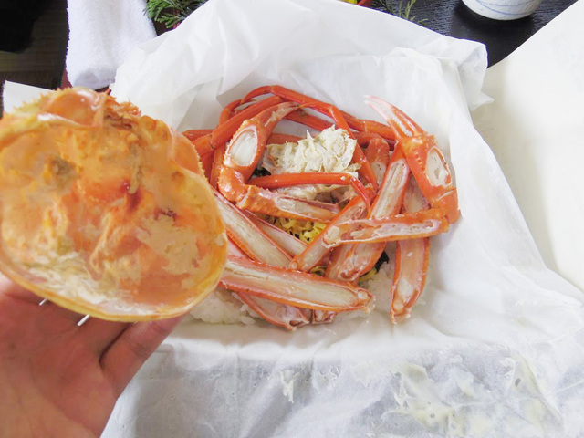 酢飯の上にベニズワイガニが一杯載っており、紙に包まれたまま蒸されています。あとは、かにをほぐして食べたり、一緒に出てくるかにみそ入り茶碗蒸しと混ぜて食べたりと、いろいろなバリエーションで楽しめます。
