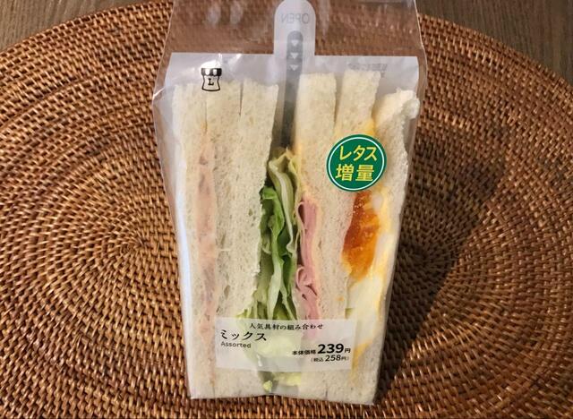 ローソンからは、2022年1月18日にレタスが増量されリニューアルした「ミックスサンド」258円(税込)をご紹介します。
