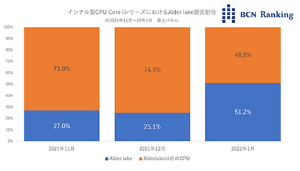 Eコア(Efficiency-cores、高効率コア)とPコア(Performance-cores、高性能コア)をどちらも搭載したハイエンドモデルの発売が先行した2021年11月、Alder Lakeの販売台数比率は27%だったが、22年1月にPコアのみ搭載したCore i5、i3の各モデルが販売されると、Alder Lakeの販売比率は一気に上昇。22年1月は51.2%となり、インテル製CPUの半数を占めるまでに至った。