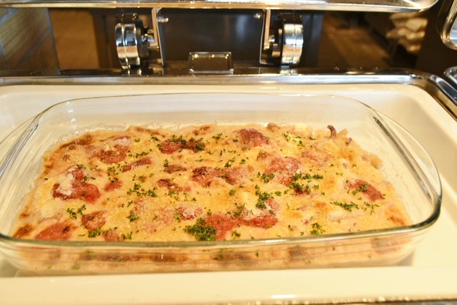 「魚介とパスタ いちご風味のグラティネ」は、グラタンの中に魚介やマカロニ、いちごが入っています。