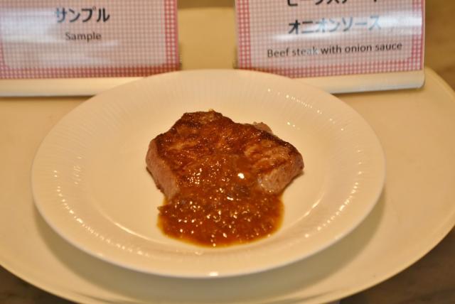 「ビーフステーキ オニオンソース」は、ステーキという名のペラペラ肉を撲滅したい私にとって、お肉の厚みは◎。