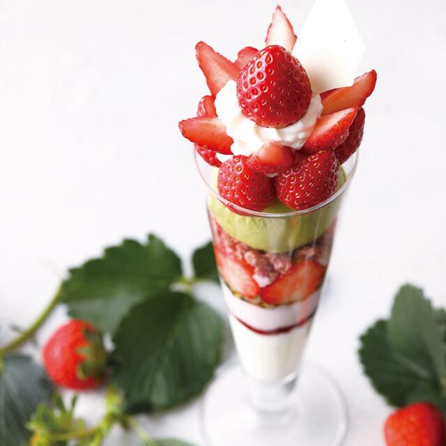 たっぷりの苺とピスタチオアイスに、甘酸っぱいフランボワーズクランチとやさしい甘さのココナッツゼリーを合わせた、春色のパフェ。