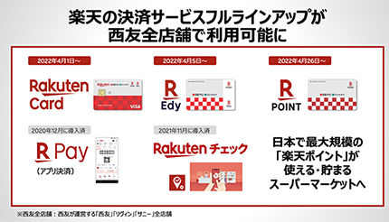 西友は、西友グループの全店舗で2022年4月26日から楽天ポイントサービスを導入する。これに先立ち4月5日に電子マネーの「楽天Edy」を先行導入する。あわせて、楽天カードは、スーパーマーケット業界との初めての取り組みとなる、クレジットカード機能付きオリジナルデザインカード「楽天カード 西友デザイン」を4月1日に発行する。