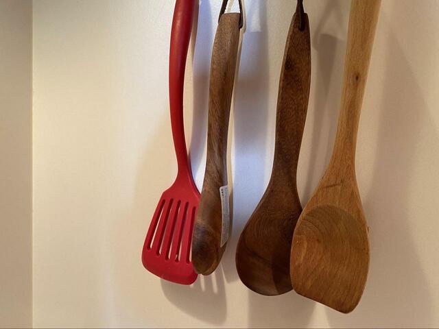 お玉やフライ返し、木べらなどの大きめのキッチンツールは、引き出しに入れておくと場所をとってしまい、邪魔に感じることも。