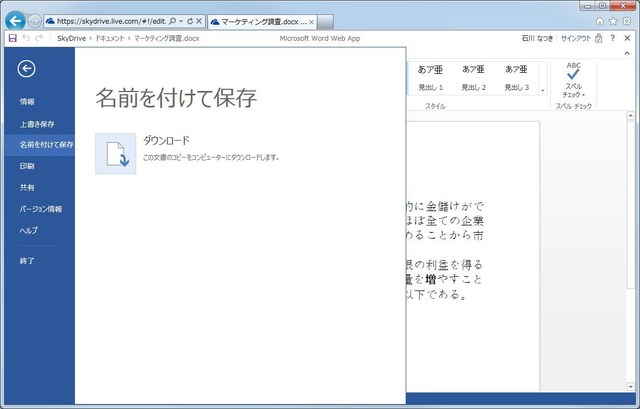 作成したファイルはSkyDrive上に保存できるため、どのパソコンからでも同じデータを扱えるのが魅力的。環境に依存されないのはやはりクラウドの利点ですね。また、印刷や「ダウンロード」保存もできます。