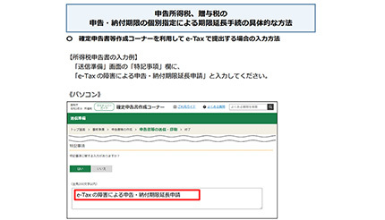 加えて、3月14日・15日のe-Taxのシステム障害により、期限内の申告が困難となった場合について個別に申告期限を延長して後日提出可能になった(郵送の場合は3月15日消印有効)。申請フローは、新型コロナによる簡便化された自己申告による個別延長と同じで、申告書に「e-Taxの障害による申告・納付期限延長申請」である旨を記載すると、申告・納付期限の延長を申請したことになる。書面・e-Taxとも有効で、確定申告書等作成コーナーを利用してe-Tax送信する場合、「送信準備」画面の「特記事項」欄に、「e-Taxの障害による申告・納付期限延長申請」と入力する。