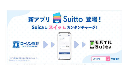 ローソン銀行は東日本が提供するアプリ「モバイルSuica」と連携して、銀行口座からモバイルSuicaにチャージできる電子マネーチャージアプリ「Suitto(スイット)」を3月15日にリリースした。