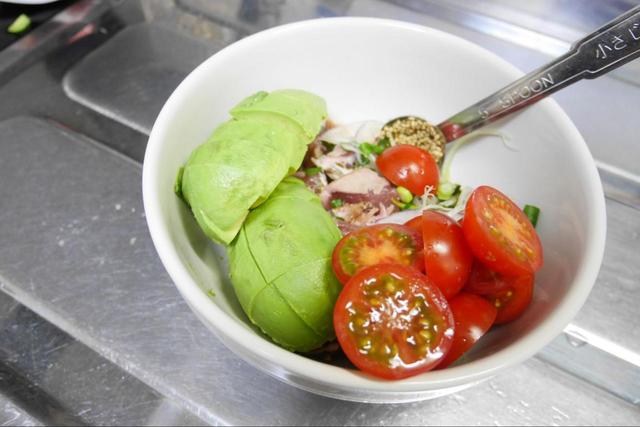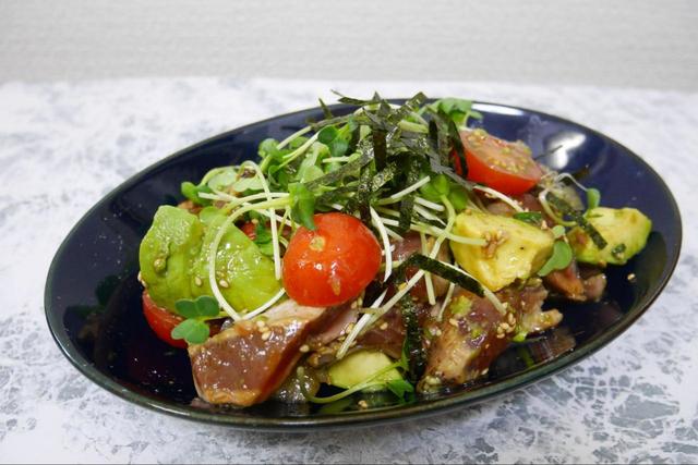 アボカド、かつおのたたきはそれぞれ小さめの一口大に切ります。ミニトマトは半分に切っておきましょう。