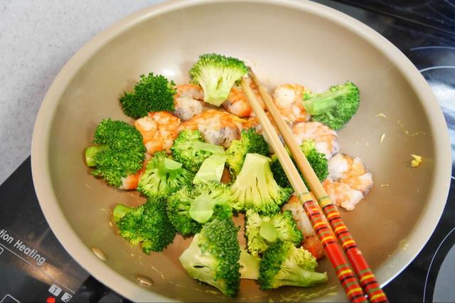 残りのごま油を足し、えびとブロッコリーを炒めます。色が変わったら卵を戻して絡め、Aを加えてさらに炒めます。
