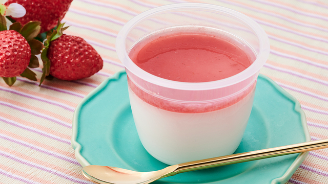 程よいミルク感と爽やかな喉ごしのパンナコッタに、甘酸っぱい苺のソースをのせています。「パンナコッタ」はイタリア発祥のスイーツです。