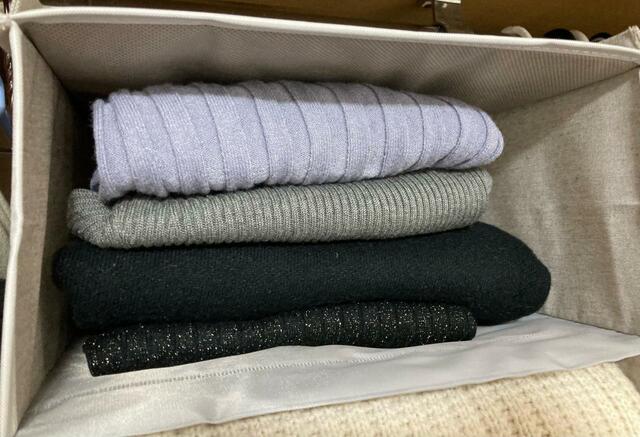 幅が小さめの上段にニットを収納してみると、薄手のタイプは4枚畳んで収納できました。