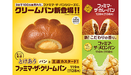 ファミリーマートは、昨年から取り組んでいる五つのキーワードのひとつ「もっと美味しく」の一環として、オリジナルパンブランド「FAMIMA BAKERY(ファミマ ベーカリー)」の「ファミマ・ザ・パンシリーズ」から、新商品の「ファミマ・ザ・クリームパン」、リニューアルした「ファミマ・ザ・カレーパン」、「ファミマ・ザ・メロンパン」を3月22日より全国のファミリーマートで発売する。