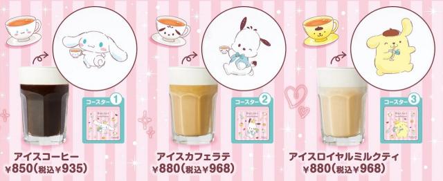 【アイスコーヒー「シナモロール」】935円、【アイスカフェラテ「ポチャッコ」】968円、【アイスロイヤルミルクティ「ポムポムプリン」】968円の3種類が用意されています。