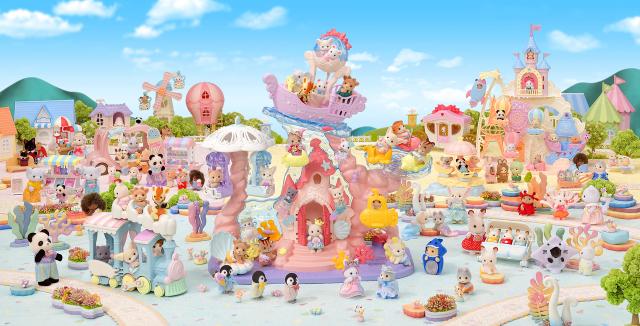 観覧車、バイキング、ゴーカート、ロケットの乗り物と、みるくウサギ、パンダ、ペルシャネコの赤ちゃんがセットになった「お城のゆめいろゆうえんち」が発売中。今後もさまざまなゆうえんちのアトラクションなどが発売される予定となっています。