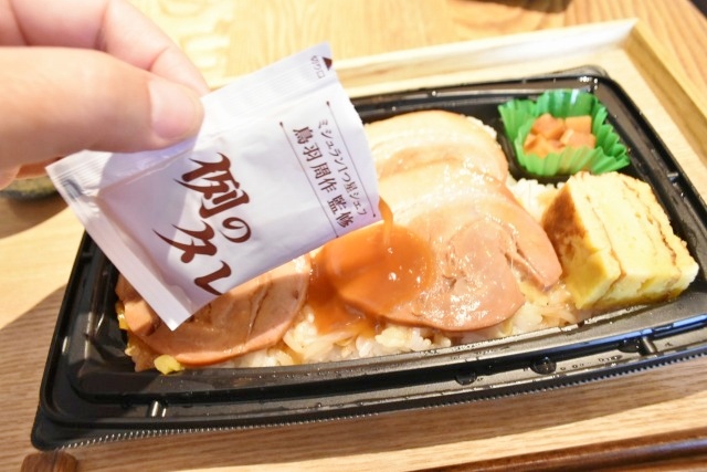 既に味付けがされている「豚生姜焼き弁当」なのですが、「チャーシュー弁当」同様、このタレをかけることで更に旨みが増します。