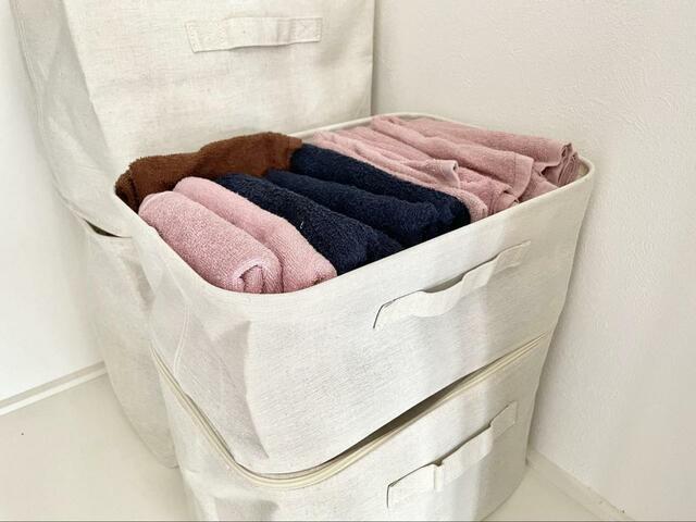 我が家は子ども用のタオルやハンドタオルがとても多く、毎回収納するのに困っていたのですが、こちらのソフトボックスを使用すると、あっという間にすっきり片付きました。