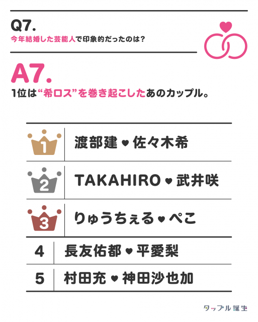 A7. 渡部建&佐々木希、TAKAHIRO&武井咲、りゅうちぇる&ぺこの3組がベスト3にランクイン。