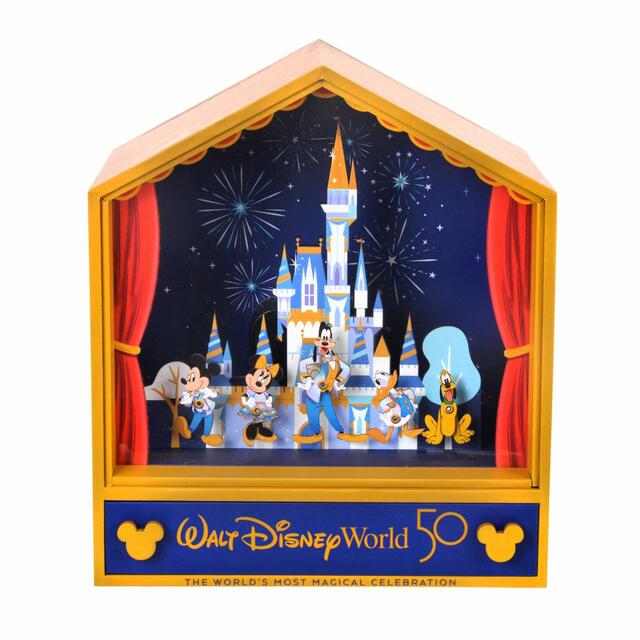 オルゴールは、50周年コスチュームのミッキー、ミニー、グーフィー、ドナルド、プルートが、シンデレラ城のの前に並んだシアター風のデザイン。