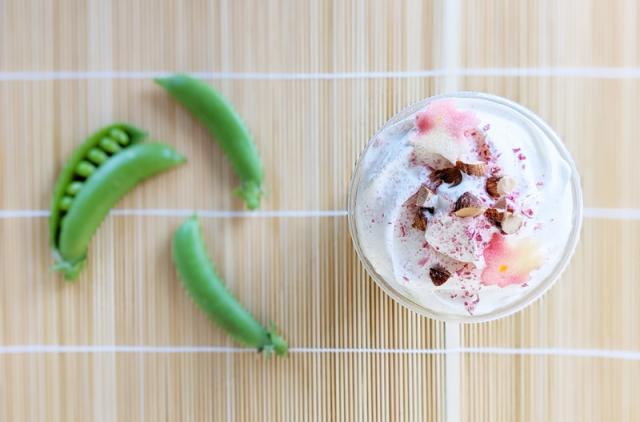 「うすい豆と桜のすりながし」は、うすい豆と桜で春の彩をイメージした一品。中の食材にはえんどう豆・海老・たけのこ・ナッツ・桜麩・桜フレーク・桜の香りの豆乳エスプーマを使用しています。