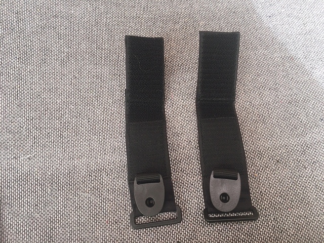さっそく説明書通りに取り付けてみました。まず、付属の短いベルトをベビーカーのフレームに装着します。